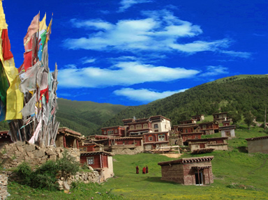 已有五百多年历史的保青寺位于四川省甘孜藏族自治州甘孜县,是历代珠宝链殊胜化身扎西群培活佛住持的三大寺院的主寺。美丽的圣达山像一位慈父盘膝而坐,拥抱着这座庄严的佛刹。清澈的尼曲河像一条洁白的哈达,围绕在保青寺的东方,滋润着周围的一草一木,一切含灵。这里树木繁茂,花草芬芳,鹿鸣鹤舞,虎熊徜徉,处处呈现着清净祥和的景象。