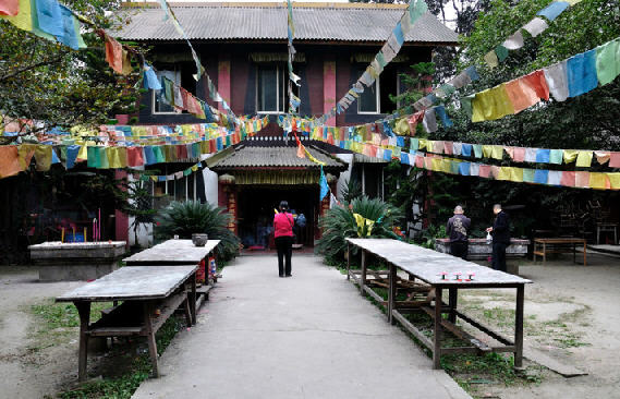近慈寺位于成都南郊的石羊场附近。寺外,阡陌纵横、流水淙淙;寺内,松柏参天,幽深静寂。仿西藏喇嘛寺特色建筑的藏经楼,巍然挺立,金碧辉煌。汉藏人民的友谊结晶——译经院,宽敞典雅,阑静古朴,异花名卉,应时而放。在这窗明几净的庭院,曾经有过许许多多青年人将藏文佛经译成汉字,培养了大批通晓藏语的人才。
