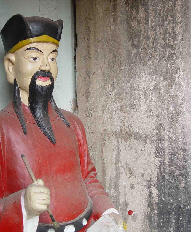 六殿壁上有清代云溪黄墨芳先生的山水壁画数十幅,其所画内容有山水、虫鸟、鱼龙、渡口、小舟以及戏曲人物、封神榜人物,造形生动,线条流畅,文饰简洁,技法精湛。特别是画中《野渡》《渔舟》《待渡》再现永宁河两岸的繁荣景象,其二是多以诗配画,其题诗粉墙内容为劝世人从善之作。一首书于戊辰岁五月的诗云: