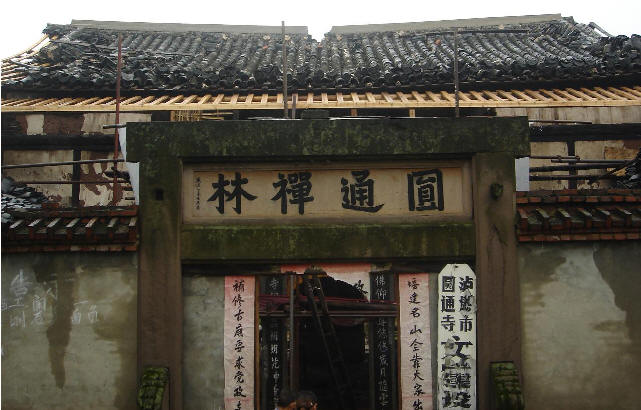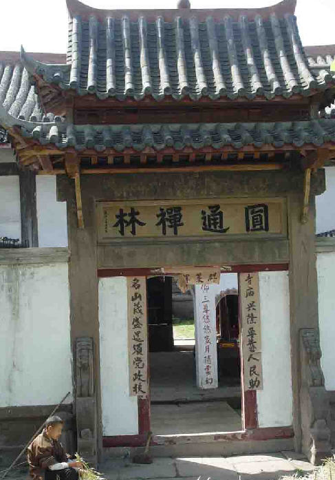 走进圆通禅林,庙中古木参天,枝繁叶茂,寺墙下金菊朵朵,争相开放,竹林排排,迎风、桂花、菩提树左右,更张显寺宇古刹之景致。穿过山门进入下殿,四大天王、接引佛、韦陀菩萨,而进殿时立有四柱三门坊,中门坊上书有:“佛仰三尊悠悠岁月随云幻;寺朝一品朗朗乾坤着露来。”左右门坊也有一联:“晨钟一响警通寺;暮鼓三声震佛岩。”两联书刻时间是“庚辰岁菊花月”并有作者石印一枚。证明是清光绪六年,即1880年,与寺中重建山门碑记所载一致。