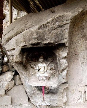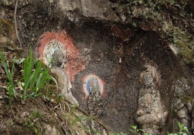 由中三味到上三昧,道路奇险。上三味古建有水亭寺和圣水亭五代时水亭寺称广明院。前蜀皇帝王衍曾专道游幸于此,明人所著(蜀中名胜记)有记载,后人称此道为“王衍故道”,至今犹在。水亭寺今已不存,但建于明朝万历年间的圣水亭尚较完整地掩映于悬崖上竹树之中。亭呈八角状,全用石料造就。亭顶用整块石料雕刻而成。亭顶所刻线条流利匀称,所雕石珠溜圆光滑,整个石亭造型精美,别具一格。亭内有石雕观音一尊,庄重慈祥,温温欲语。亭上方有一崖窝,长约丈余,宽约两米。有泉从崖中泌出,冬旱不干,夏洪不溢。这就是悟达国师洗人面疮处。