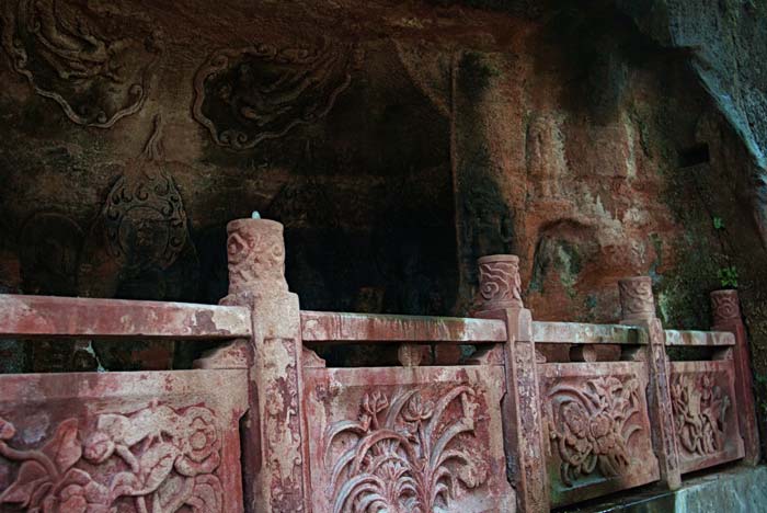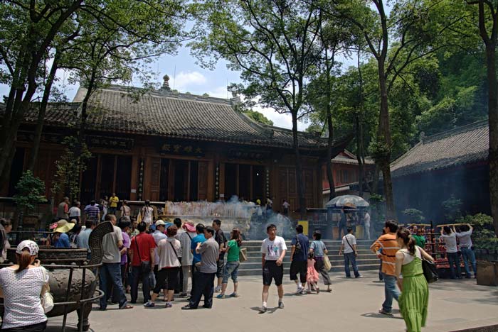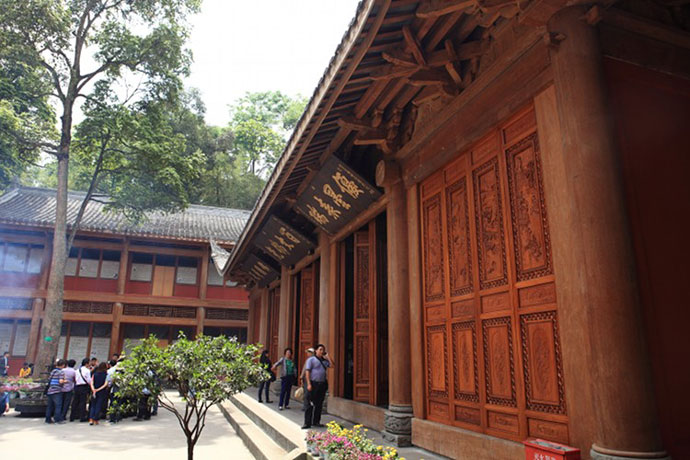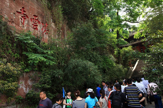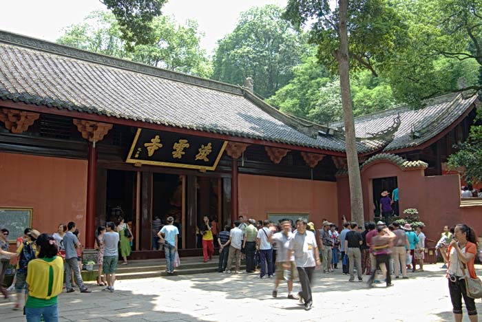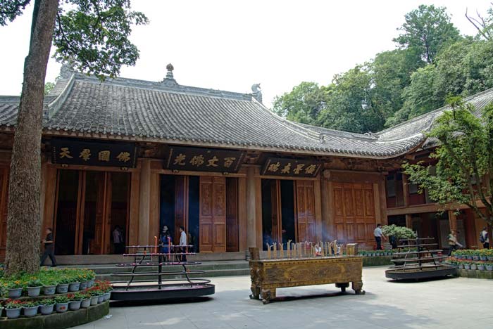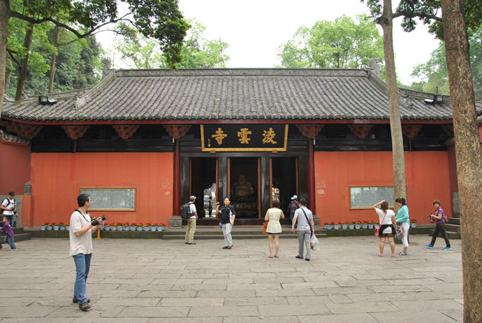 唐开元初年(公元713年)开凿佛像时,寺字又有扩建。据《方舆胜览》记载:“会昌前,峰各有寺”,可见会昌以前佞佛之风的盛行。但到会昌四、五年间,由于唐武宗李炎扬道抑佛,以僧尼耗蠢天下”为由,下令灭佛,凌云山寺庙仅凌云寺得以“工作精妙”而保存。岑参《登嘉州凌云寺》一诗曾这样描写凌云寺:“寺出飞鸟外,青峰载朱楼“不过,我们今天所看到的寺,早已不是唐代原貌。唐建凌云寺,毁于元顺帝战乱,明代进行了两次较大修复,明末又经毁。现存凌云寺是清康熙六年(公元1667年)重新修建的。以后又经多次修茸,尤其是解放后不断维修,保存了现在面貌。 凌云寺是由天王殿、大雄殿、藏经楼组成的三重四合院建筑,丹墙碧瓦,绿树掩映。天王殿前是参天古木楠树,殿外两侧分列着四座明清两代重修寺字的碑记。殿内正中塑像为弥勒坐像,皤腹欢颜,俗称“大肚罗汉”。两旁分列四大天王塑像,攒眉怒目,威武雄壮。天王殿后为韦驮殿,供奉木雕装金的护法神韦驮。穿过天王殿,为明代建筑大雄宝殿,是僧众举行宗教活动的主要场所。殿内正中端坐释迦牟尼三身像(今身、应身、报身),造型优美,神态庄重。两旁分列十八罗汉,神形各异,栩栩如生。大雄宝殿背面是新塑的净瓶观音,两边分列文殊、普贤、地藏和大势至四菩萨像,是明代以前的作品。