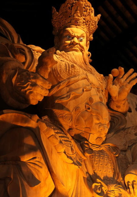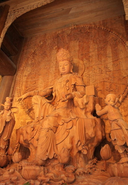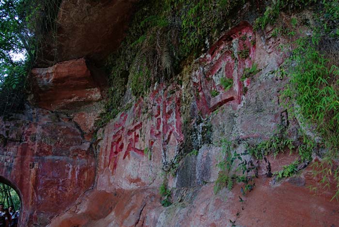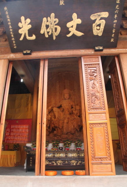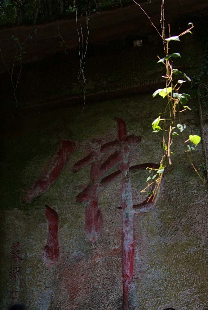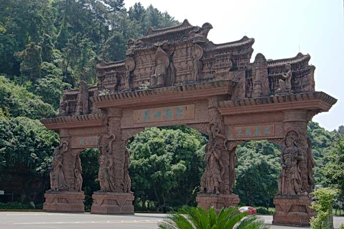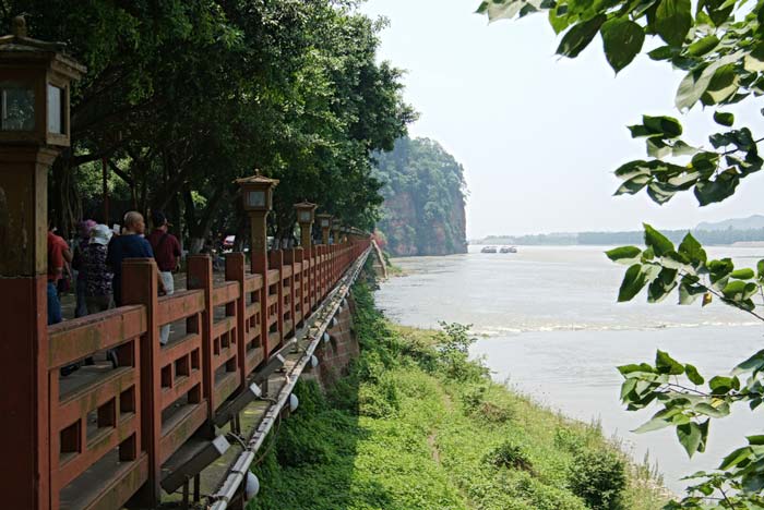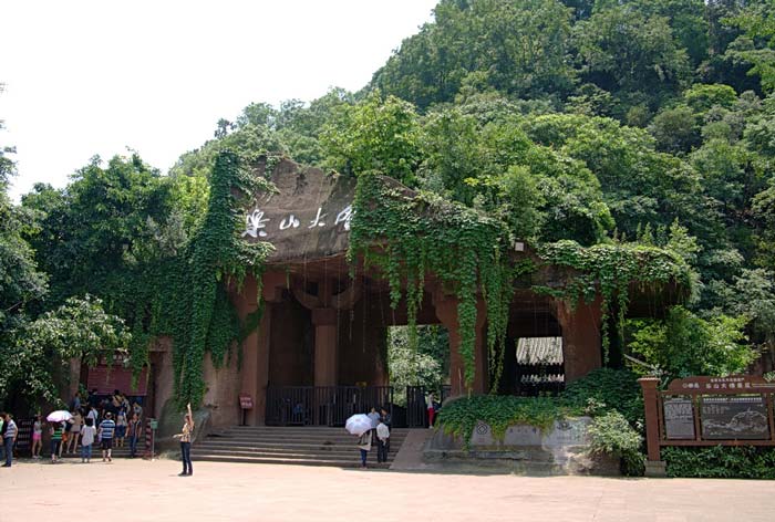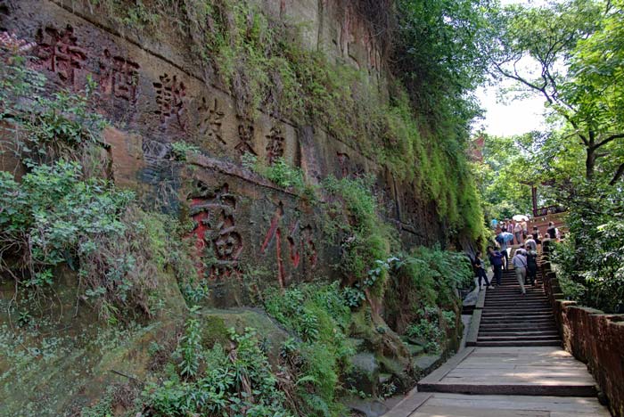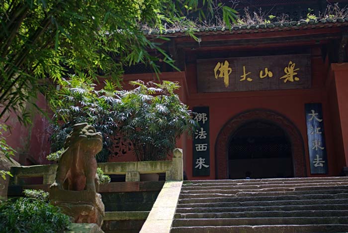 过载酒亭,举目仰视,凌云寺寺门高踞,飞檐凌空,红墙碧瓦,巍峨壮观。寺门正中高悬巨大金匾,上集苏东坡书“凌云禅院”四字。两旁联文是“大江东去,佛法西来”。此联言简意赅,既使人有佛法庄严之感,又表明了凌云寺所踞地理位置,还巧妙地将“大佛”两字嵌于其中,显示了这座千年古刹的不凡气势。