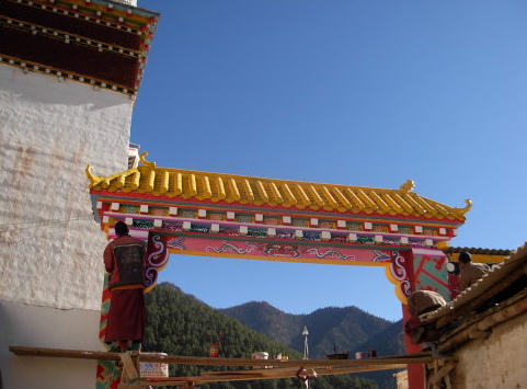 离开寺院时,工匠头气愤不过,挥舞利斧朝大殿门上砍了一刀,这一刀将原来开门时发出的“扎西”(吉祥,声变成了“喀障”(倒霉)声;原来关门时发出的“拥科”(福禄来临)之声变成了“堆得”(败家)之声。