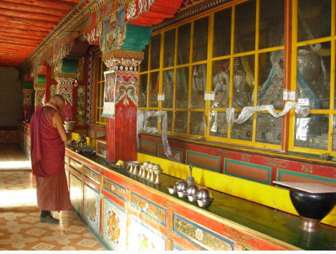 三尊精美别致、栩栩如生的佛像是黄教创始人洛绒扎巴三师徒的塑像,那古色、古香的经书除多为佛教经文