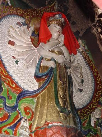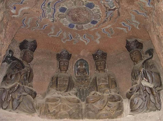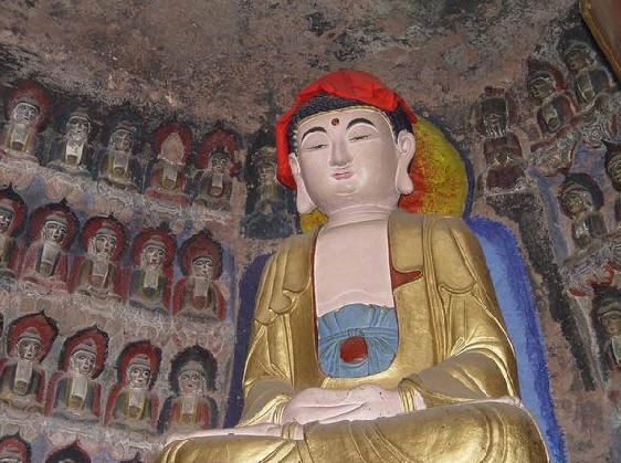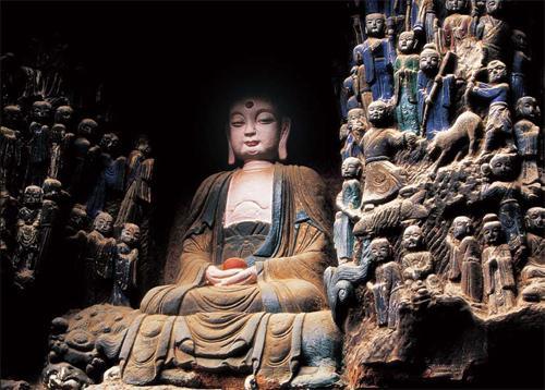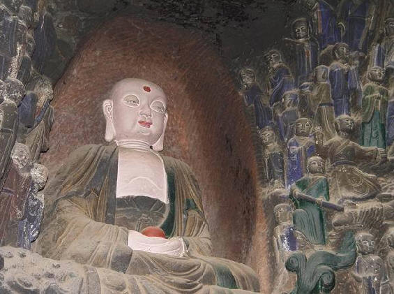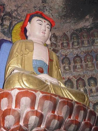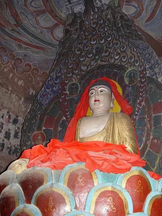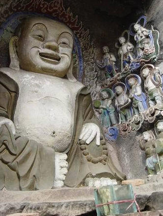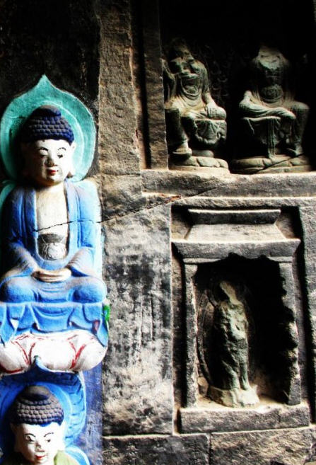 摩崖正中是药师佛造像,只见佛像体态丰满,两目炯炯有神。这个石龛顶呈圆形,装饰精美,有彩绘和雕刻结合的一组飞天。同时,药师佛龛石壁顶部镌刻有纪年题记。