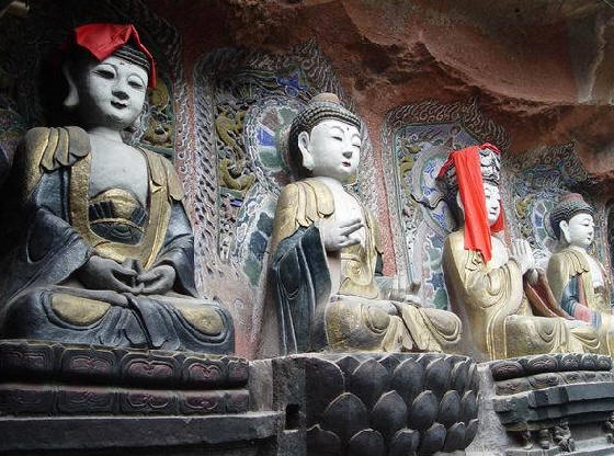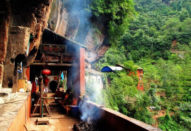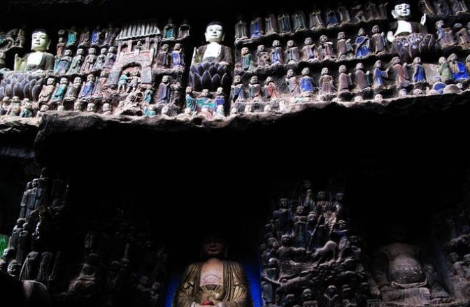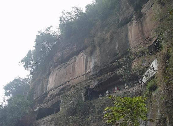 药师岩的石刻塑像群,在半山腰上的峭壁之上,密密麻麻的摩崖雕像,占据了整个山壁。令人叫绝的是,雕刻这些石像的工匠们,在峭壁上开出了一条长一百五十多米的回廊,回廊上还建有房屋、亭台、门洞。