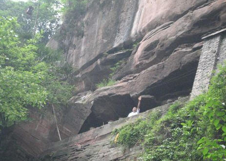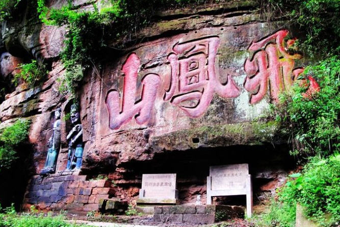 沿着曲曲折折的石级而上,闻着山间绿树青草散发出的清香,经过三十多分钟的跋涉后,药师岩终于出现在了眼前。首先映入眼帘的是在悬崖上镌刻的「飞凤山」三个雄壮浑厚楷体大字,这几个大字为清代翰林伍嵩生所书。