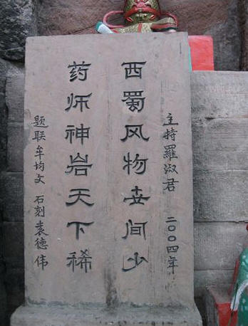 此外,还有宋代成都李昌存、眉山史伯高、丹棱李淑可、济南庞仲昂、明代嘉靖年间洪深、清代许考义等人均有游览题记存于石壁之上,从不同角度赞扬药师岩奇绝的景物。这里除题记外,原有两副石刻的对联,其中一联为江苏宿迁县人蔡鼎镇所撰书:“石云和梦冷;花气逼泉香。”另一联为洪雅祝之至书:“洞开佛骨山吞月;法护龙泉雨落花”。联文生动、形象地描绘出了药师岩优美的自然景色。