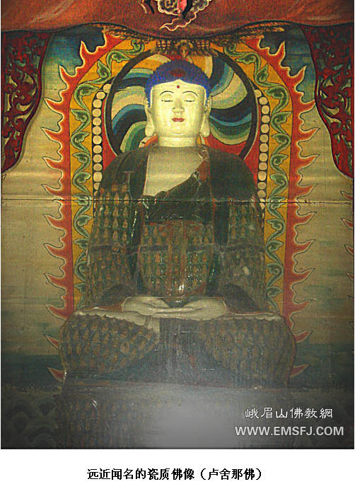 寺僧惠光法师曾于明永乐初年去江西景德镇募化观音瓷像,无果而返。永乐十三年(1415年)四月初八,景德镇瓷商谢元芳来峨眉与商家田万鳌结帐时发生口角,惠光法师苦劝双方,谢、田最终和睦。为感谢法师恩德,谢、田二人发心,在景德镇塑烧一尊瓷质大型卢舍那佛像。佛像运到峨眉供奉在寺院中,寺名也随之改为“磁佛寺”。