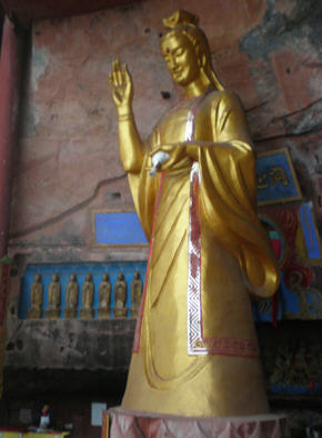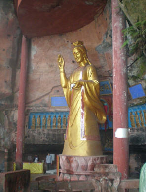 观音殿前,紫竹观音手握净瓶,倾倒神水,普渡众生。