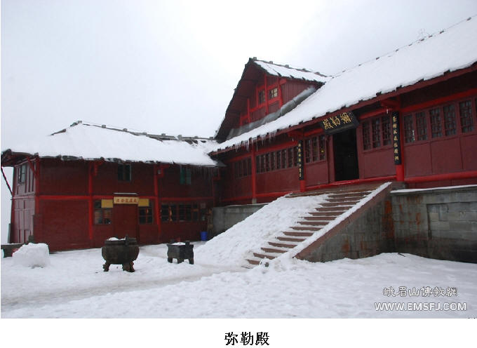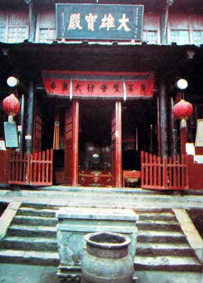 进新建山门沿石级而上,第一殿为弥勒殿。殿门(即老山门)横匾,上匾为“天花禅院”,下匾为“洗象池”。门上聊曰∶“台榭花飞绿树稠,石桥水隔红麈香。”落款∶“清人岷樵撰聊,一九七九年秋许肇鼎补书。”