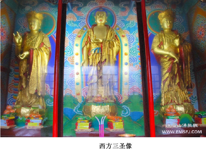 第三殿为观音殿。塑供观音大士趺坐金莲之上。两壁悬挂二十帧观世音书像,木镜框,每帧高一.二米,宽○.八米。