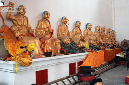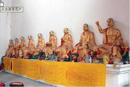 “三身佛”背面为观音殿,朝北的正中供奉三尊高大的佛像,中间是阿弥陀佛,左边是大势至菩萨,右边是观音菩萨,两边是18罗汉等佛像。