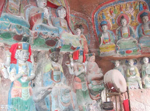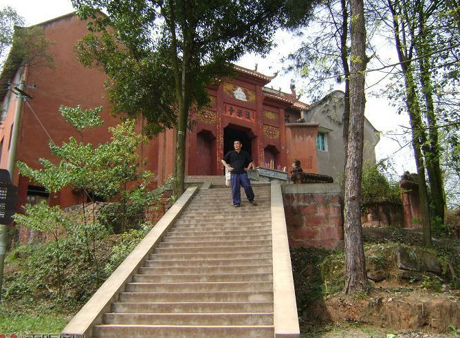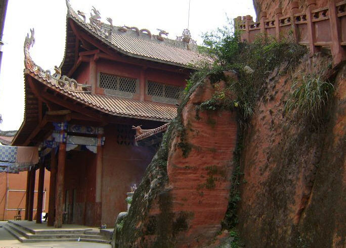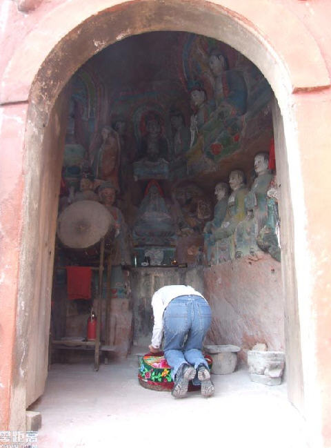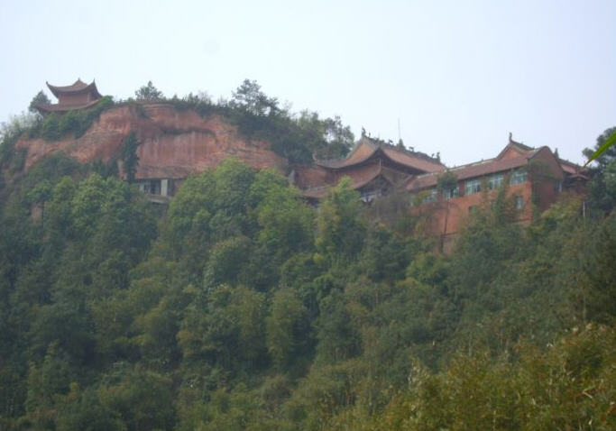 沿着山脊迤逦而行,远远便可看见掩映在松林之中的红墙黄瓦,“流米寺”三个大字映入眼帘。该寺由流米禅院建筑群、流米洞摩崖石刻群、观音殿、洞顶佛殿组成。前殿塑弥勒佛、四大天王,后殿塑如来佛,两侧十八罗汉,与一般寺庙并无二致。感到很特别的,是前殿弥勒坐像之后,还塑有一释迦牟尼立像,这是在佛寺中仅见的。而流米洞,则位于大殿之后,是县级文物保护单位。在我等的要求下,负责保管钥匙的79岁的居士刘婆婆,给我们打开了洞门。进入洞内,但见崖壁上叠次依序雕凿有18龛43尊摩崖石刻造像,这些造像以佛像为主,也有道教和儒家的偶像,如关公、财神、土地爷、魁星等。从雕像的风格上看,应是成像于明、清时期。据说,早先的牛鼻寺仅是牛鼻洞内的摩崖石刻,又叫半边寺,先后作过道教的庙、佛教的寺,甚至道、佛、儒先贤同奉,这从现今留存的造像可以得到印证。山崖的东侧,有一石级小道直通崖(牛头)顶,登上崖顶,极目远眺,胜天坝和李庄坝尽收眼底。