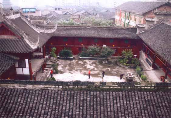 宜宾市翠屏区佛教玉佛寺,位于宜宾市翠屏区李庄镇线子市街32号——李庄的镇中心,始建于清道兴二十五年,座南向北,由山门、戏楼、大雄宝殿、观音殿等组成复合式四合院。建筑以砖木结构和木雕为主,原名“天上宫”,供奉海神“妈祖”,由福建籍移民集资修建,是历史文化名镇“九宫十八庙”的重要组成部分。天上宫有大量的木雕艺术,以深度浮雕为主,辅以部分镂空雕,内容多为传统戏剧故事。原圣母殿前的檐口上排着四根雕刻精美的龙凤货斜撑,表达了对天上圣母的尊崇,也反映了历史上的繁荣和建筑水准。虽然在“文革”中曾遭受过一定程度的损坏,但总体上仍有很高的艺术价值。