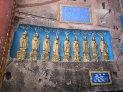 大雄宝殿和小雄宝殿内均有三世佛(如来、药师、陈弥陀),佛前各有一块高1米的九龙碑。碑由整石镂空精雕而成,九龙飞绕,形象生动逼真,碑的当中刻有“当今皇帝万岁万岁万万岁”字样。大雄宝殿三佛两侧还有文殊、普贤塑像,分乘青狮和白象。后侧分别有送子观音和财神菩萨。两侧还有神态各异的十八罗汉。