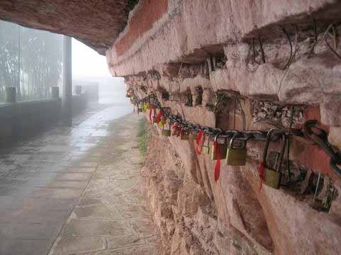 从竹海山上沿石梯至擦耳岩绝壁处,前临万丈深壑竹海大峡谷,让人胆颤神摇。崖前飞泉跌瀑,溅玉飞珠。山门洞侧“九转拐”处,有民国书法家傅襄模手书刻写的“迎仙台”三字。字的大小有尺余,字迹如迎风翠竹,潇洒流畅。