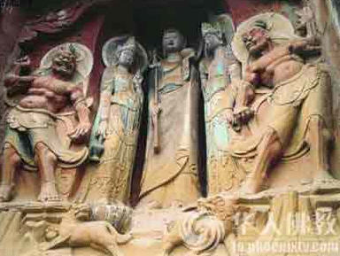 水宁寺石窟,现存造像27龛,近300躯,全系佛教造像艺术。主要内容有“释迦说法像”、“药师三尊变”、“释迦多宝并坐说法像”、“五佛”、“释迦真如舍利塔”、“观音菩萨”等。这些造像多为盛唐作品,少数为晚唐雕刻。它是石窟艺术古代匠师们在雕造和彩绘中发挥了卓越的才能,创造了许多栩栩如生的人物、动物、植物形象,达到了引人入胜的境界,堪称我国唐代石窟艺术中高水平的作品之一。尤其是菩萨、伎乐天神的雕造和彩绘,“女性化”十分明显,肌体细腻丰满,体态婀娜多姿,容颜俊丽动人,衣饰富利堂皇。真谓之曰“菩萨似宫娃”。这不仅使“神”具有美的形象,而且有一定的世俗人物的思想感情和生活气息。第1号龛是“药师三尊变”。主尊药师如来,左胁侍为日光菩萨,右胁侍是月光菩萨。龛楣两角各刻一飞天背向起飞。这些彩雕,均为世俗人物中典型的“美人”形象。第2号窟中的二供养人,男者秀丽,女似宫娃,纯是汉民族中的美男子和窈窕少女形象。总之,在造像中的人物形像,各具有不同性格和神情。大体上,佛和菩萨像是温静慈和,天王、力士是威武勇猛,弟子和供养是人恭敬虔城,飞天是欢乐活泼。第2是“释迦牟尼说法”窟。主尊释迦佛,身披圆领袈裟,结跏跌坐于须弥座上,左手扬掌作“施无畏印”说法状,情态温和。迦叶立于佛左,双眼深陷园睁前视而炯炯有神,刻划出了一个年高望重的弟子形象。阿难于佛右,面相清秀、神姿虔诚。第8号窟,二胁侍菩萨,左文殊,右普贤,均体态丰肥娇柔,面部表情温善娴静。二天王,左者,齿咧眼鼓,神态凶恶。右侧飞天,身长才33厘米,而飘带长达95厘米,几乎为身长的三倍,飞动之形十分可爱。
