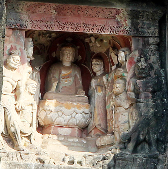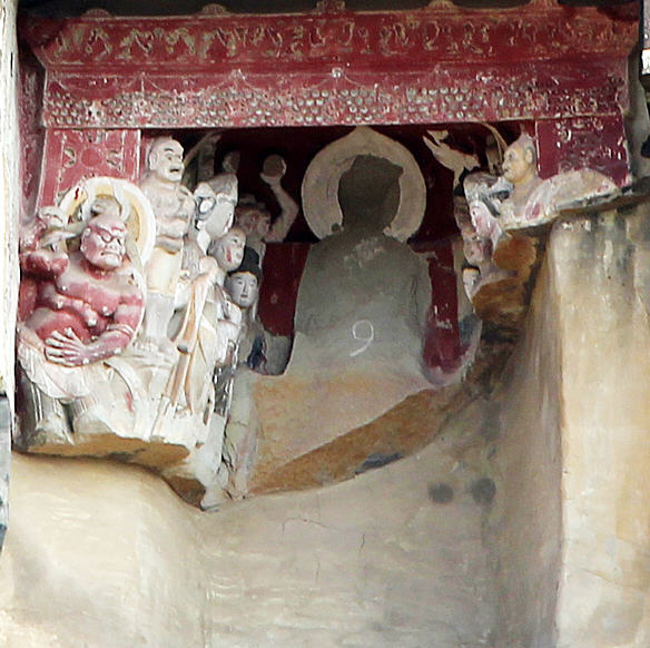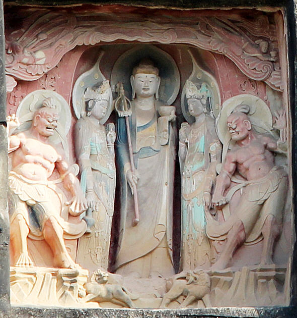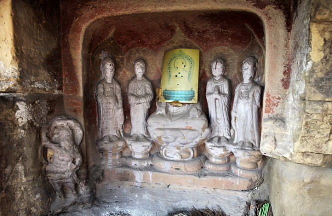 药师佛窟龛高二○○厘米,宽一七八厘米,深七十厘米。后壁凿圆拱形小龛,高一六四厘米,宽九五厘米,深三八厘米。内龛凿有一佛二菩萨。主佛高一四二厘米,为药师佛,另一说为地藏菩萨。主佛束螺髻,大耳,额有毫光,身着通肩蓝色袈裟,后有桃形火焰纹头光。左手托药钵于肩前,右手扛锡杖于肩後。二胁侍菩萨侧立两旁,两身均高一二四厘米,头戴花蔓冠,身着华衣,手戴镯,臂饰钏,披帛着地,璎珞满身。