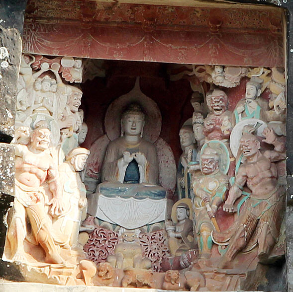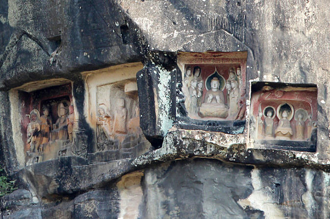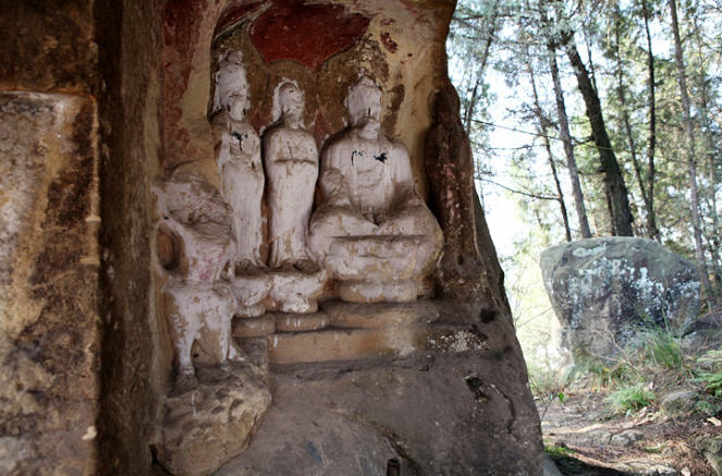 水宁寺石窟,地处巴中县城东37公里的清江、斯连、花溪三乡交界处。水宁寺,古为始宁寺。《寰宇记》云“废始宁县,在县东南五十里。梁普通六年(公元526年)于此置遂宁郡,又于郡理置始宁县,因山为名”。隋开皇三年废郡。北宋乾德四年废县,省入化成县(今巴中县)。水宁寺石窟就座落在古遂宁郡、始宁县故地水宁河两岸的始宁山、龙骨山麓。