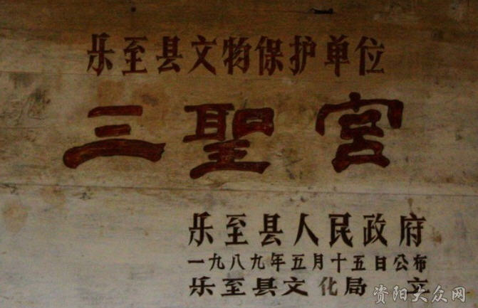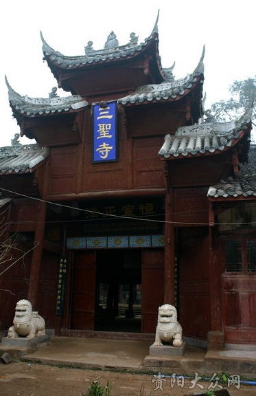 三圣寺原名“三圣宫”,因宫中塑有三国时代人们崇敬的刘备、关羽、张飞三圣神像命名。位于中天镇桂林场街村正街上,左右均邻居民商店房。系县文物保护单位。始建于清代道光十三年(1833)。建有大雄宝殿、观音殿和偏殿3个殿堂,泥塑有刘关张像、雷电、川主、观音、牛王、油灯等神像14尊。僧人释常慧、释眼清、释大兴、释罗兴等居庙中。每年举办观音会、碧山会、川主会、雷主会、单刀会。数百信众云集,香火旺盛。民国时期,宫曾作乡公所办公地、桂林中心小学校地,菩萨和神像被毁。人民共和国成立后,1952年第四区公所驻地,撤区后桂林乡人民委员会驻地。撤乡镇后,于2000年,县人民政府决定,将三圣宫房业移交给灵音寺管理委员会管理使用,其产权属于国有。当年8月,由灵音寺管理委员会接管,并改宫为寺。与灵音寺合为一个管理委员会,会址定在三圣寺。住持僧人为释昌能。