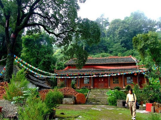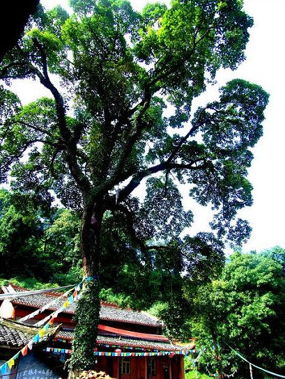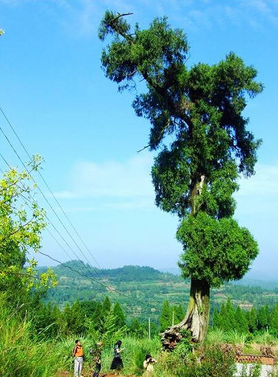 这些古柏承受着乐邑雨露,阅尽人间****,经几百年风霜仍然枝叶繁茂,生机勃勃,挺秀一方。它们有的主干挺拔,铁骨嶙峋,像擎天大柱直抵蓝天,刚直不阿;有的枝叶舒展,像舞蹈家那样体态轻柔,婀娜多姿,给人们带来乐趣和遐想。有10多对“夫妻柏”,当地人叫它“鸳鸯树”。“他(她)们”粗大直挺,树枝簇拥,绿叶相吻,交颈而立,手握着手,夫妻相互依偎在一起,倾诉衷肠;还有一对“老夫妻柏”,两棵柏树顶皆有枝无叶,好似一对饱经风霜,患难与共,相亲相爱,秃顶的老夫老妻。在山顶东侧有棵“姊妹柏”,同根相生,枝体亭亭玉立,风姿绰约,犹如一对双胞胎孪生姐妹一般。3棵“母子树”,每根母柏高大,所背的子树低矮,在母树正中,其根系环绕母树,英姿奇异,观者惊叹!三足鼎立的3根“雷打柏”,树高13米,树尖直径0.8米,4人牵手相围,树根间小孩可随意穿行,远观象一神奇的根雕艺术珍品。最为珍奇的是北麓和山腰各有一株黄桷树寄生于一株古柏之中,同生同长,俩相合抱一起,当地人们把它叫做“黄相公抱白小姐”。象这样两树合抱一起,同生同长的还有黄林树与柏树、黄林树与女贞树、黄林树与榕树,共计8根。更有奇者,黄林树与榕树与女贞树,三树相抱,同生同长,却也别有情趣。