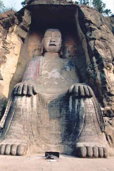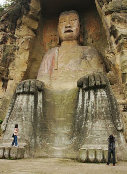 在拍了几张无香客的大佛照片后,面对寂静无语的大佛,我只好自导、自演地打坐于佛像前,请彪哥为我存照一张。