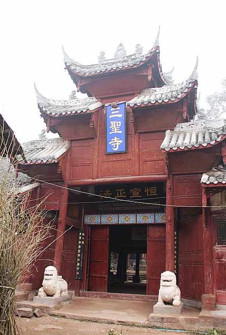 原名“三圣宫”,因宫中塑有三国时代人们崇敬的刘备、关羽、张飞三圣神像命名。位于中天镇桂林场街村正街上,左右均邻居民商店房。系县文物保护单位。始建于清代道光十三年(1833)(一说建于清朝嘉庆年间)。建有大雄宝殿、观音殿和偏殿3个殿堂,泥塑有刘关张像、雷电、川主、观音、牛王、油灯等神像14尊。僧人释常慧、释眼清、释大兴、释罗兴等居庙中。每年举办观音会、碧山会、川主会、雷主会、单刀会。数百信众云集,香火旺盛。民国时期,宫曾作乡公所办公地、桂林中心小学校地,菩萨和神像被毁。人民共和国成立后,1952年第四区公所驻地,撤区后桂林乡人民委员会驻地。撤乡镇后,于2000年,县人民政府决定,将三圣宫房业移交给灵音寺管理委员会管理使用,其产权属于国有。当年8月,由灵音寺管理委员会接管,并改宫为寺。与灵音寺合为一个管理委员会,会址定在三圣寺。住持僧人为释昌能。