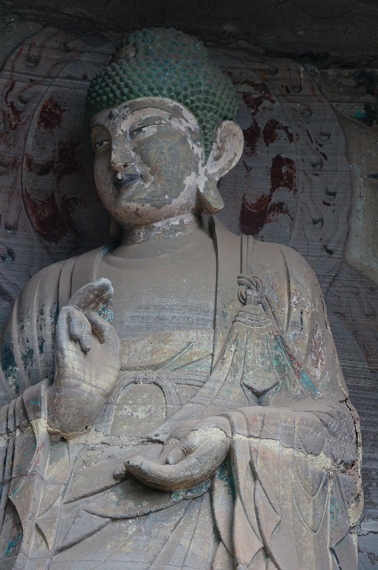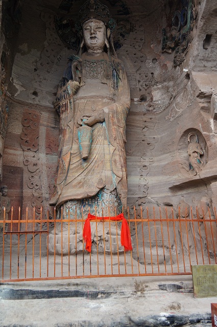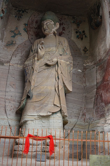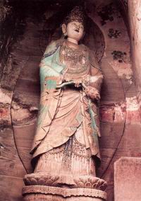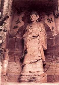 北岩以北宋时期造像为主,其中“西方三圣”形体高大,造型优美。“西方三圣”为阿弥陀佛、净瓶观音和大势至菩萨。他们分别雕刻在高8米,宽5米,深4 米的巨大人造石窟中,各石像躯高都在7米以上。中窟雕刻的是阿弥陀佛,他头蓄螺髻,身披袈裟,内着僧衣,右手结说法印,左手结与愿印,面向左侧,双目俯视,姿势飘逸,神态庄严,大有佛法无边、威德慑众的佛教鼻祖风范。左窟是净瓶观音造像,她头戴镂花宝冠,左右髻飘然其眉,耳垂珠环,身着宝缯,遍体璎珞缀饰,足踏莲花,左手提净瓶,右手执柳枝,眉目中闪射着慈悲神情,俯视着芸芸众生,大有悲天怜人之感。右窟中雕刻的是大势至菩萨,她头上的花冠雕刻得特别精致,冠上还镌刻有一尊小坐佛。大势至菩萨容貌俊雅,慈眉善目,安祥聪睿,倩丽端庄,双手交于腹部,右手握着象征圣洁的莲蕾,大有慈航普渡受苦受难的芸芸众生出苦海之感。三龛造像窟中还镌刻有似飞鸟凌空、曼妙飘逸的飞天,其鲜活优美的舞姿使人仿佛感觉到了天衣在飞扬,满壁有风动。《人民画报》早在20世纪50年代,就曾对这些飞天进行过摄影刊载。