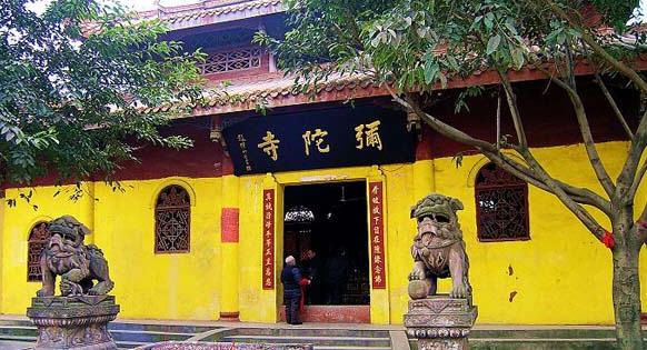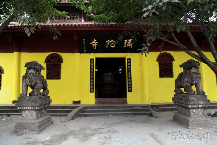 简阳市弥陀寺原名东岳庙,始建于明代,民国二十六年更名为弥陀寺。庙宇废于1950年。1989年经简阳市政府批准,在昇陽洞(原莲花寺旧址)重建。系钢筋混凝土古典造型。由山门、四殿、一洞和钟鼓楼、客堂、僧房、塔林院、放生池等组成。占地38亩,建筑面积5000m2,工程浩大,气势恢弘。有僧人十多人,住持释了性。1990年经简阳市人民政府批准开放。寺庙位于城北1.5公里,现升阳三组,地处绛溪河畔,山清水秀,为当今简阳第一禅林,是市内外旅游者、佛教信徒旅游观光和信徒朝拜的圣地。是中外宾客和佛教信徒汇集的一方净土。