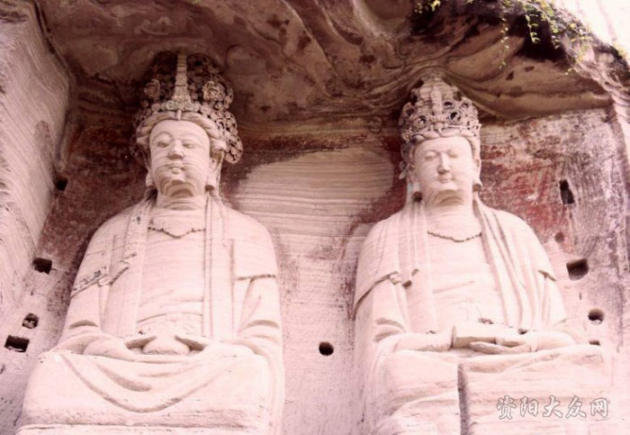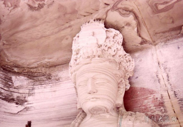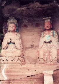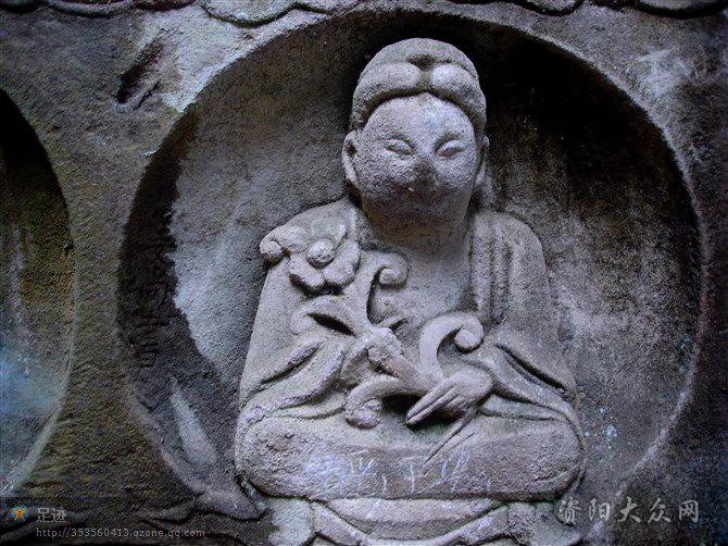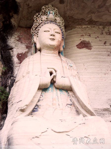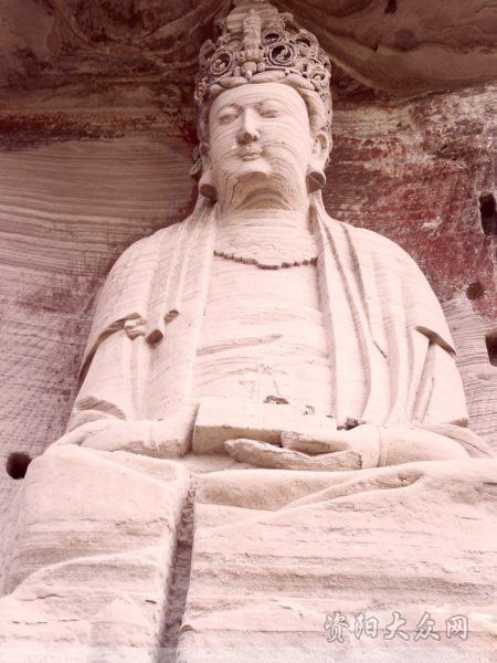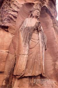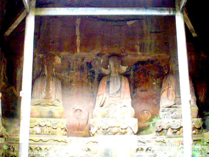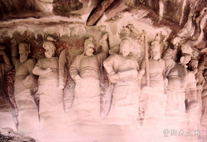 此处现存摩崖造像63躯。单个造像34躯。另有明、清碑刻题记29处。造像总长达350米,气势宏伟,石像高大,其中高5-7米8躯,1-4米的50躯,均雕刻有造像,或佛祖,或菩萨、金刚、力士。佛祖、菩萨多为慈眉善目,神态安祥,宝冠装饰无一雷同。金刚、力士多龇牙咧嘴,钉杀气腾腾。观音菩萨、大势至菩萨和文殊师利菩萨高5-8米。观音菩萨左手前伸,平托纱巾;大势至菩萨左手内曲置于胸前,五指并拢平托厚厚的经卷;文殊师利菩萨左手托经书外伸1.5米,书和手的重量上千斤,历经千年不毁,全靠高2.2米的垂地袈裟支撑,运用力学与美学结合,造型十分巧妙。后岩壁上的护法神龛内造像呈半圆形,集中雕塑均高1.8米的十二个护法神,皆甲胄鲜明,其手或提九仗剑,或执便托杵;其头或昂扬猛呼,或怒目扭颈;有的剖腹见心,有的捏拳定神,虎视眈眈,威猛剽悍,真心睃寻法场,虔诚拱卫佛士。