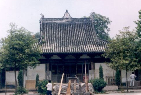中殿建于明正统十二年,坐北向南,宽深各10.10米,呈正方形。其格局系九宫八卦模式,融入“八天干”“十二地支”组成的搁榫式建筑体系。这种格局是古代天子居住的“明堂”,为一般建筑少用。四周不用裙板,而采用中国的传统建材,从阑额到地袱高3米,通体编篾,然后涂上棕丝捣绒泥和白灰。主体工程完在后,隔了19年(明成化二年)方在壁上绘上“十二园觉菩萨”。历时550年,无虫蛀、无裂纹。而阑额部分楼台亭阁,犹金光熠熠,神采飞扬,烟云舒卷自如,堪称民间壁画精品, 《中国佛像艺术》赞美有“唐代遗风”。惜“大跃进”进期,毁掉佛像,作为仓库堆积粮食,致画斑剥。据壁画师研究,此画非一般颜料,乃矿物精粉,可管800余年。