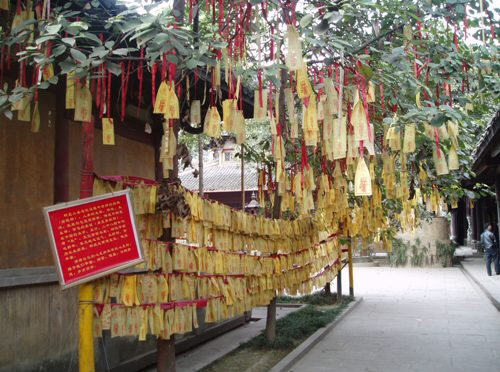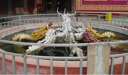穿过山门,走进寺院。门内放置着一道木制的屏风,在屏风的背面雕刻着一幅双龙图,在屏风背面的上方的横梁子上悬挂着一块“蜀王消夏行宫”的横匾。屏风正前方的庭院里,立着一尊花蕊夫人的雕像,她一袭白衫,衣带飘飘,头颅微微上仰,双手后背,执一卷诗文,似在默诵,似在思考。在她的前面,两方小巧的莲池左右各一相对而设,只是我来的还不是时候,池里的莲花还未开放,只有几片荷叶漂浮在清清的池水面上,池畔石栏的上面还有一些素雅的雕花,倒也更加显现出花蕊夫人的冰清玉洁。
