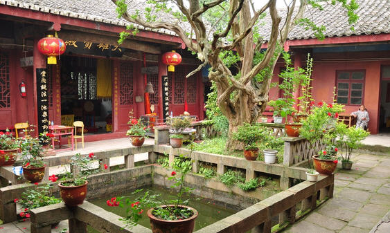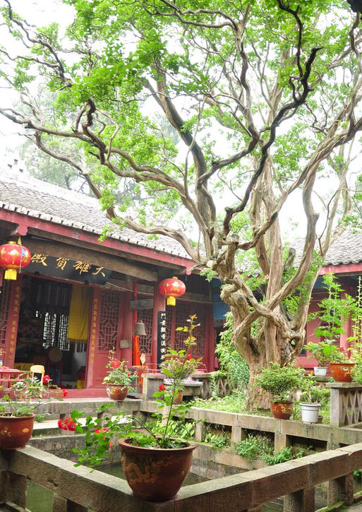 进入大门,中有一天井,迎面是观音殿,你那观音一手持杨柳,一手持净瓶,高座于莲台之上,慈眉善目,悲天悯人,苦渡世人,从侧门穿过,进入又一重院落。院中一棵紫荆树伸展枝梢,直指蓝天,这就是剑门四奇之一千年紫荆,该树有一千五百年左右树龄,通体无树皮,当地俗称“痒痒树”(用手象挠痒一样挠树干,树会象人发痒一样会颤动)。有时两年一花,有时年年开花,其花呈白色或紫色,很是奇持。树下有乌龙(学名蝾螈)常夏秋潮湿时出现。