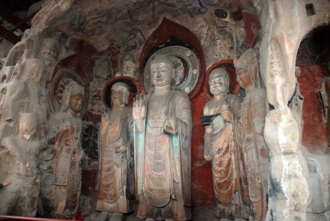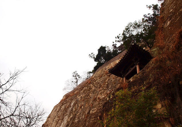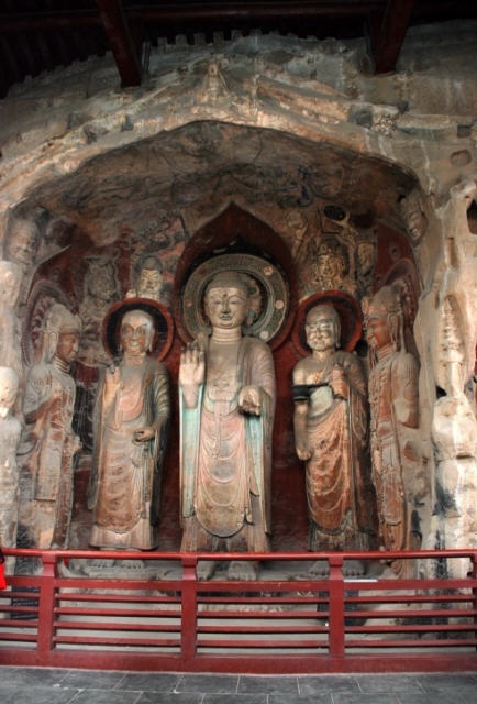 中心柱窟,位于则天殿之上,窟约13立方米,中间有一根完整的石柱,其实是一座造型精美的经塔,三面石壁都刻有佛像,正中是释迦牟尼,左右是文殊、普贤,围绕三尊佛像刻有飞舞蛟龙,据有关人士考证为北周时所刻。