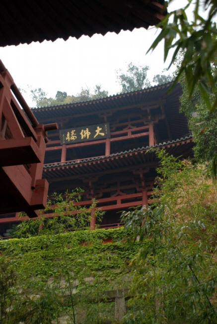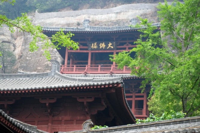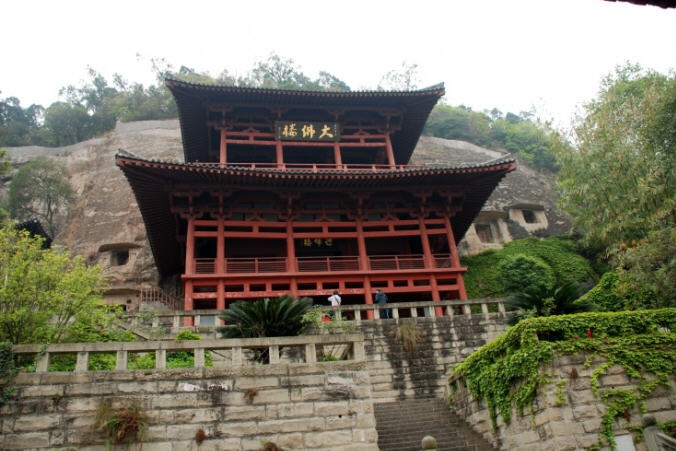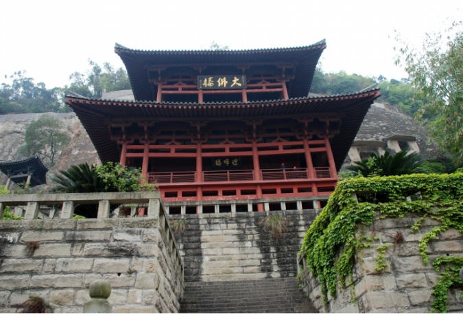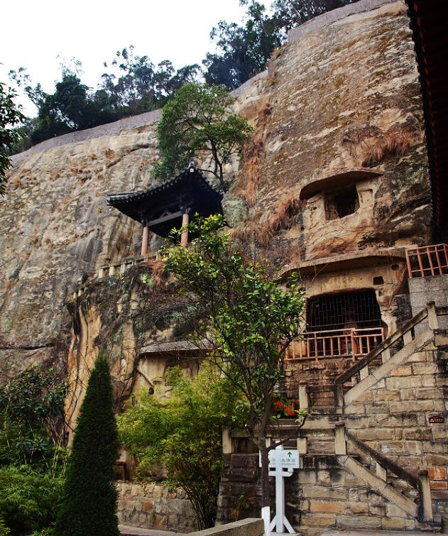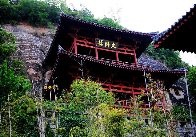 大佛楼,位于中心石窟之上。窟高7米,宽5米,深3.8米。这是一龛中国盛唐时期的摩崖石刻造像作品,正中释迦牟尼大佛高约6米,庄严肃穆,气魄雄伟,左右两侧弟子和力士个个雕刻逼真,栩栩如生。大佛背后刻有“天龙八部”,在变化多端的彩云中若隐若现,十分生动。