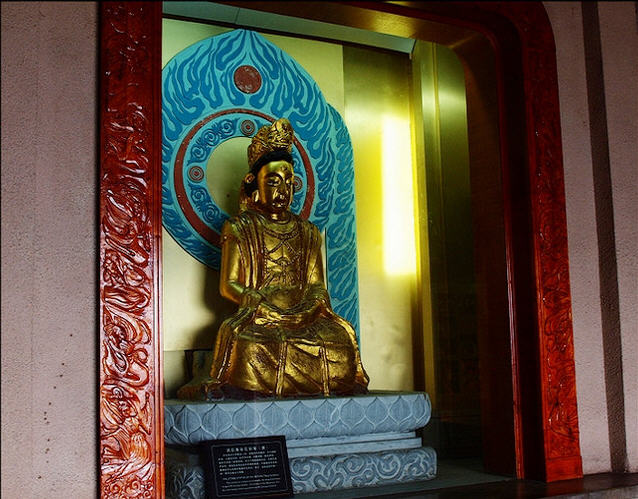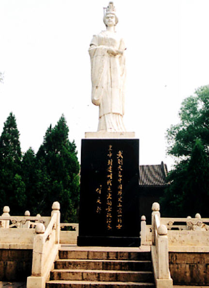 广元皇泽寺石刻则天殿,位于皇泽寺内的中心建筑大佛楼下层,其殿始建于唐,历史上曾称"武后真容殿"、"则天圣后殿"。现殿内端坐着金身的武后石刻圆雕像,头戴饰有坐佛的宝冠,胸饰缨络,半臂披帛,双手交于腹前作禅定印,结跏趺座,下著裙,披覆于方形石座上,冠服、坐式,一如比丘尼,面相宽额广颐,和史籍记载吻合。武则天,名望,公元624年生于广元,公元705年死于洛阳上阳官。宋人《九域志》载:武则天当皇帝后"赐寺刻其真容"。这尊真容石刻造像,就其形象,有两个特点: