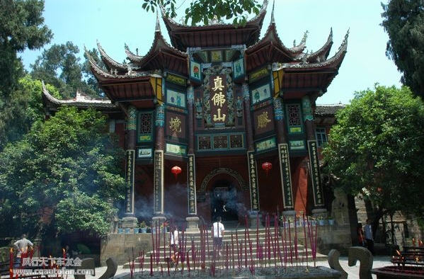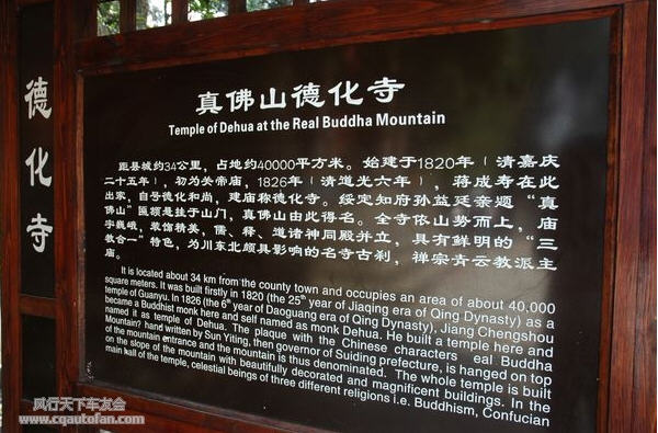 真佛山山势陡峭,从山脚至山门,松柏密绕,翘檐朱梁,有千步石阶直伸山顶,犹如半空垂下的云梯,两旁香樟夹道,越向上苍松古柏景越深。全寺建筑面积约15000平方米,依山势布建,庙宇巍峨,装饰精美,儒、释、道中的佛、菩萨和神像同殿并立,并有“三教合一”的鲜明特色,是川东北颇具影响的名山古刹,也是禅宗青云派的主庙。几座殿堂错落有致地分布于山腰、山顶之间,寺周古树苍柏相拥,林木葱笼,鸟语虫鸣,使人有“万籁此皆寂,唯闻钟磬声”之感。寺庙由“玉皇殿”、“天子殿”、“金刚殿”、“大雄宝殿”组成。其中大雄宝殿为主殿,殿内直立两座18层宝塔,高30米,半身藏于寺内,半身破顶而出,自殿外望去犹如破土春笋,生机勃勃。主殿两侧的钟鼓楼高约20米,共4层,层层各具特色,分别置大鼓和铁钟。寺内楹联、字画、壁雕、历代僧墓群和佛教经典非常丰富。每年农历六月十九日在观世音菩萨诞辰之时,便是德化寺的传统庙会,那天人山人海,香火旺盛, 如果能赶上传统庙会,那更是不虚此行。 在此游览不但能听到优美的传说,还可以领略到山林的峻美与奇险。