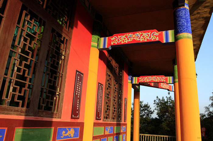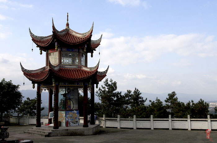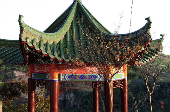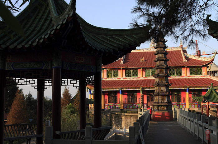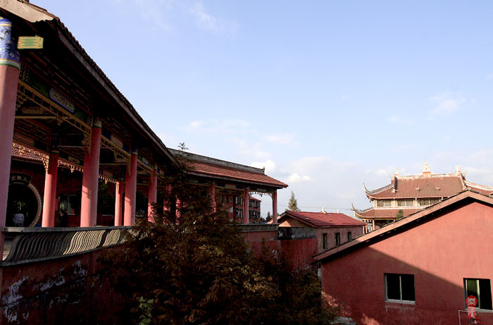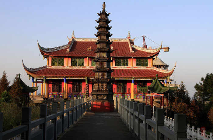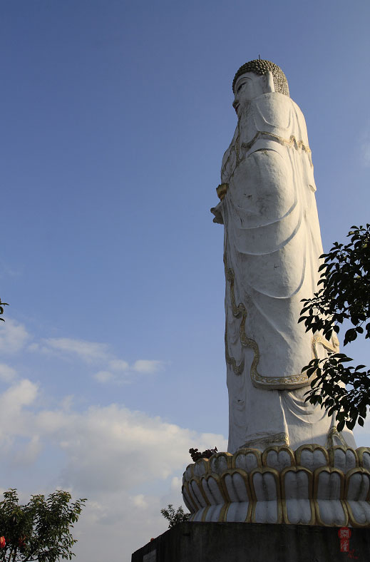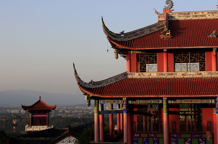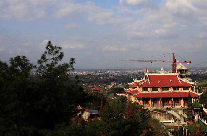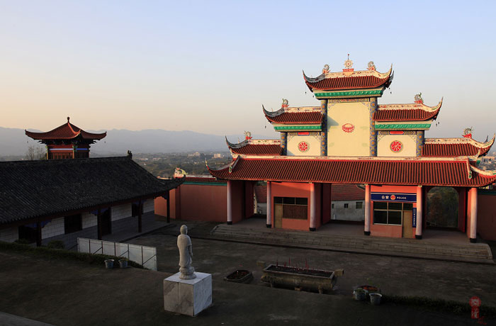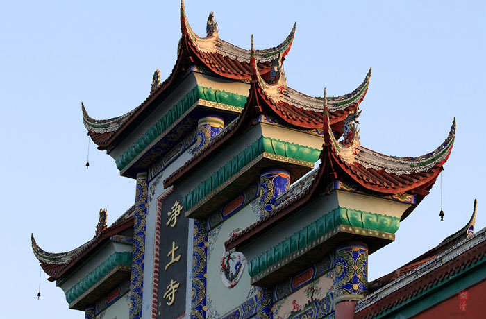 距大竹县城郊3公里莲印乡天生村境内的净土寺占地面积116亩,建筑面积2万余平方米。鸟瞰全寺,龙首塑高16.8米阿弥陀佛像镇寺,身中轴线上9重殿宇俨如梵王宫阙,9重殿堂楼亭点缀于郁郁葱葱之松林中,若隐若现,殿堂松林,相互辉映,梵音鸟鸣,天然浑成。该寺东南西北,四围壁立,岭峭十丈,山峻雄奇;由东南而西北,蜿蜓跌宕,似巨龙腾空,欲飞苍穹。东南龙头,形如冠状,故曰高冠山。