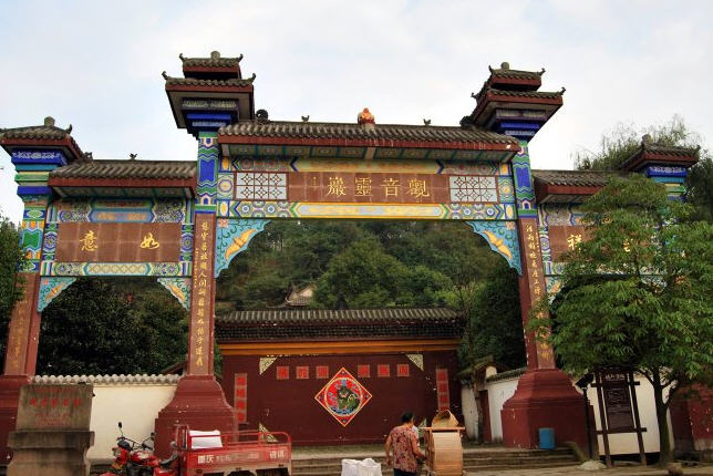 观音岩,本名白石崖。明代弘治年间,罗江名士吴白崖寓居岩下苦读,曾镌“白崖仙合”的四字于峭壁,有神托梦骑瓦龙. 其岩左侧有石似并例三鱼呈南游状,故老相传:“观世音居于南海,携三鱼至,独显圣于西蜀吾土”。岩壁正面,乾隆三十四年(1676),罗江县令杨周冕所书“西来古佛留东坠,云外高僧认雪山“的石刻楹联,至今仍保留在岩上那“鬼斧神工”的“灵石”之上。“三鱼石”、“灵石”无疑为这里赋予了神迷的色彩。从泞江河;这往观音岩仅约百米。步入造成型古朴、高耸云天的山门,三座雕栏石曲拱桥引你跨过流水潺潺的山溪。桥上游人如织,让人感到石刻艺术那充满生命的灵气。
