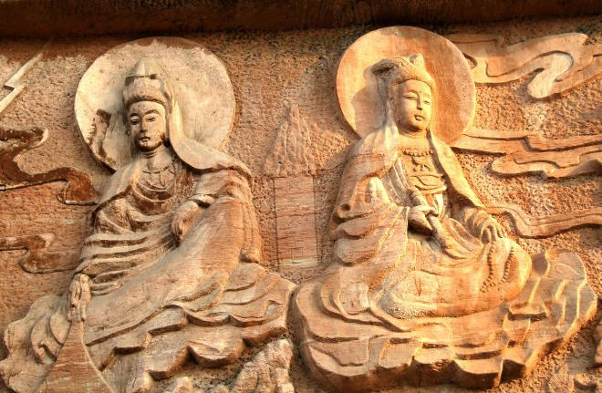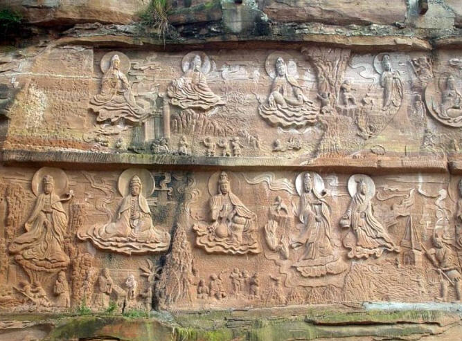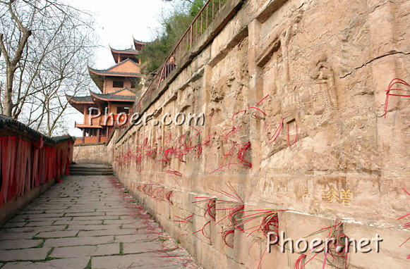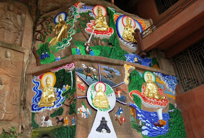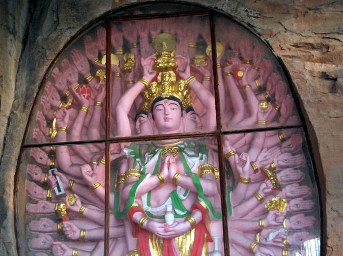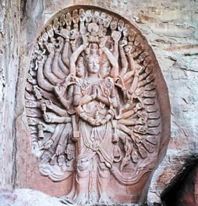 再从龙泉井两旁拾级而上,便进入了摩崖造像精华的观音岩主崖地段那长达百米如刀削般陡峭的石壁上:千手观音、南海观音“救七难”及“三十二应身”,或圆雕、或浮雕,具有逼真、丰盈、生动、明快的特点。最具艺术特色的石刻当数千手观音,高5、7米的千手观音半园雕 像屹立在巨大的石壁上,抬眼望去:飘逸的观音似乎从天而降,寻声救难、呼之欲出。这尊造像借用了敦煌石窟的雕刻技艺,使雕像既有传统佛教的艺术美,又体现出现代美。“七救难”和“三十二应声”造像在众多的岩石雕刻中,算是微型的摩崖造像。然而,那人物头上的发巾、服饰上的拆皱、胸上的络缨一一可见,可谓传统艺术中的瑰宝。