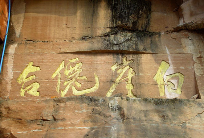 这座依山而建的建筑,就是观音大殿。大家右边的这些石碑,就是记载着自1992年当地政府对观音岩修复以来的各方游客和当地民众善举的功德碑。那么在进入观音大殿以前,请大家留意一下岩壁左侧镌刻的“白崖仙合”四个大字。这四个字有什么含义呢?据史料记载,这就是我们刚才介绍的罗江名士吴白崖寓居此地时读书坐过的岩石,据说有一天他在这块岩石旁读书,读着读着就睡着了,在梦里,他看见一个神仙骑着瓦龙飞到他面前,对他说:“你将会考取三九之类的名次,前途无量啊!”我们都知道3乘以9等于27啊,结果当年吴白崖果真考中了举人的第27名,在淳化任县令,后来又到了泾阳,举为陕西循良。因此这里又有了“白崖梦龙”的典故,再后来人们就用“白崖仙合”来命名这块岩石,观音岩从此有了白崖之名,同时也成就了一段佳话,更添了其神秘与灵性。