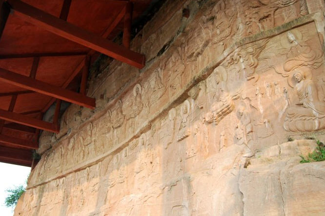 由白衣观音左行,长达六十余米的石刻长廊把家喻户晓的二十四孝、十三忤逆报应故事用深浮雕的手法再现于石壁之上。浮雕栩栩如生、潜移默化,颇有中国工笔画的特色,更具有传统文化教育的深刻意义。