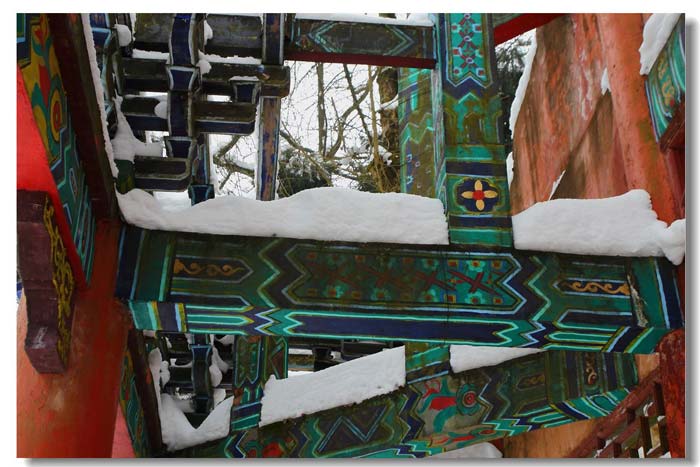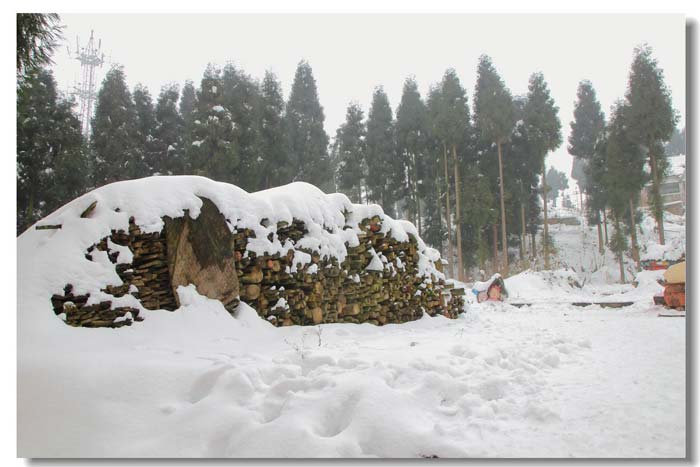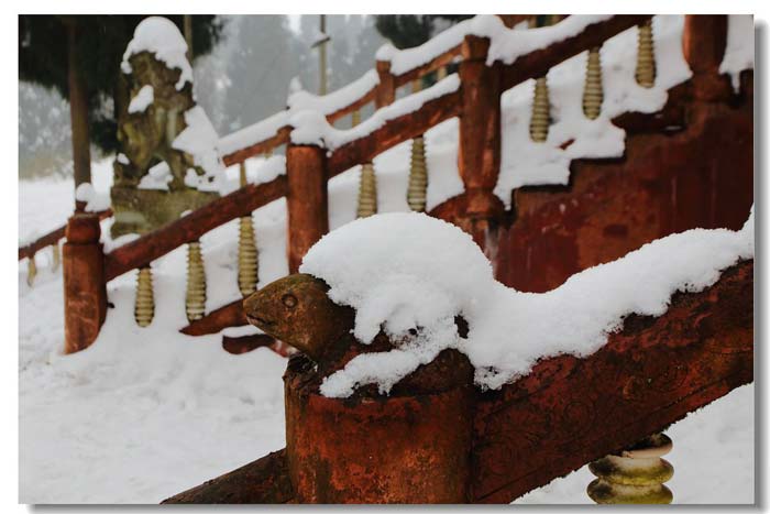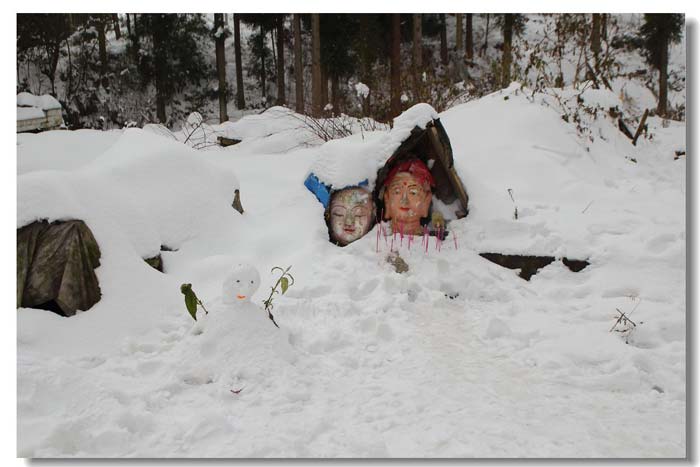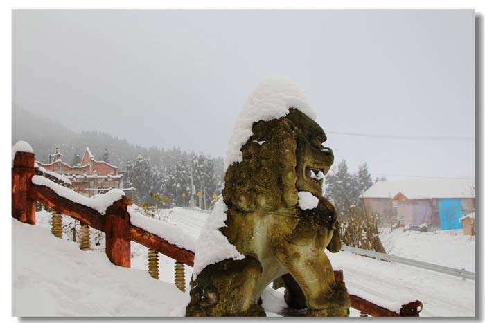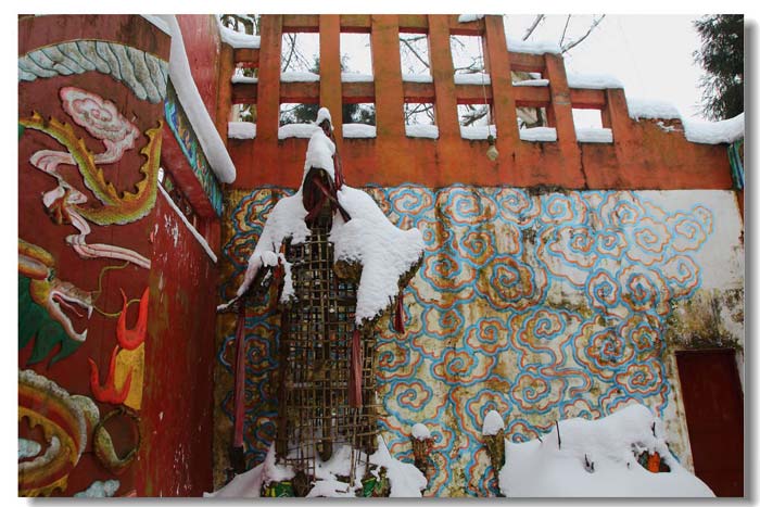 关家殿昔日塑有关羽、关平、周仓父子神像,现已无存,仅剩地名和一地天光云影。但关家殿视野开阔,头顶天青如水,脚下绿涛汹涌,右可望彭州葛仙山,蓥华主峰,俯首有烟林为缀,村舍点点。偏是冬天,钟鼎寺积雪半尺,放眼之间一派银色世界,高景关的雄阔峻拔,石亭江的大气磅礴,让人心底豪气顿生。明万历年间号称西湖外史的什邡人曹楷在《蓥华游记》中有这样的句子:“庚寅大雪深三尺,弥漫布苓,对火不敢出,纵观孤峰峭壁,箐林陡涧,景色奇绝”——可谓道出了钟鼎寺风光之绝妙。