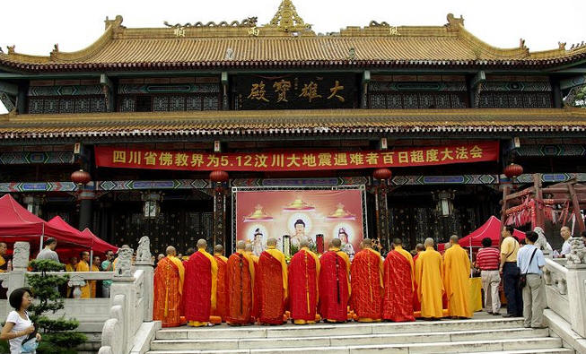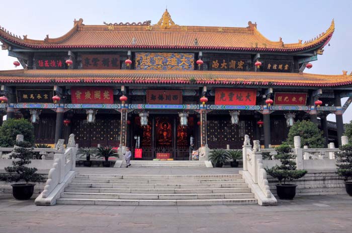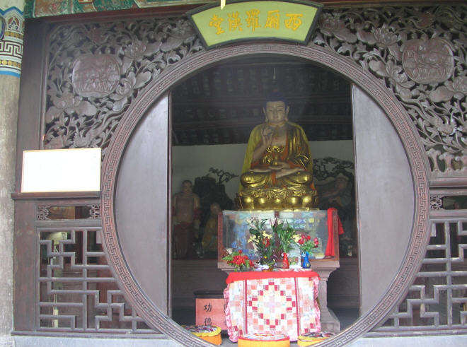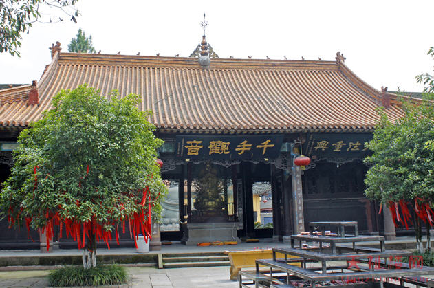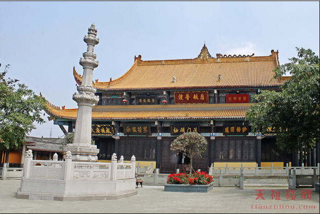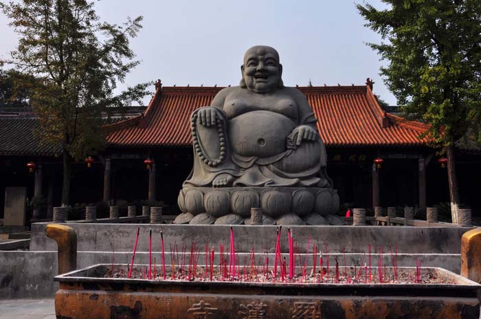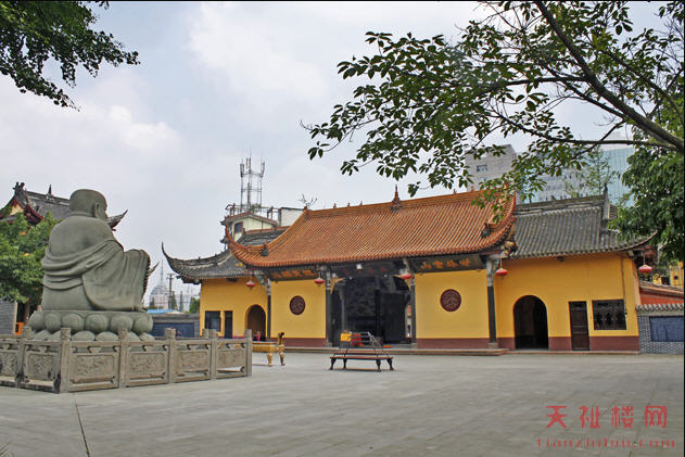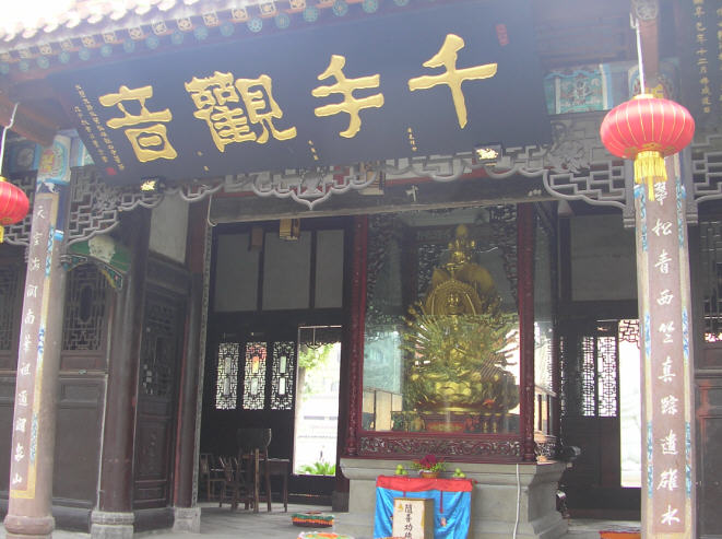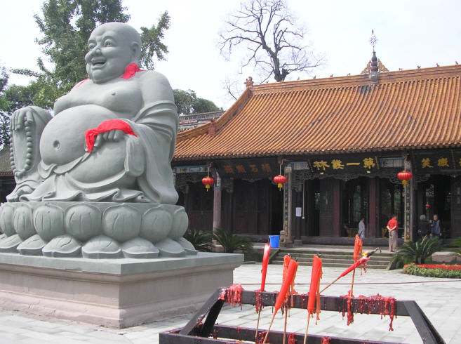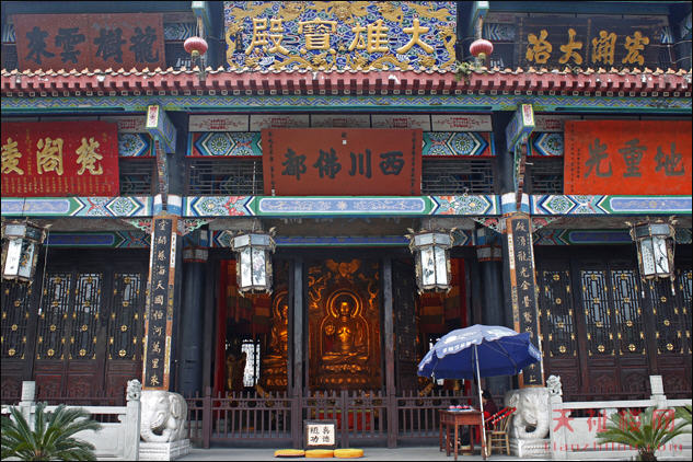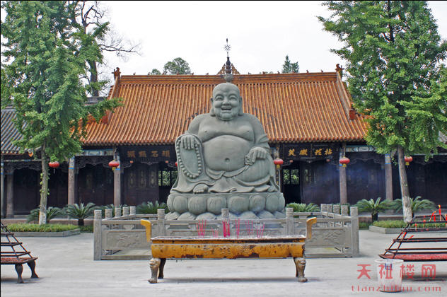 佛寺造像,皆精美传神。天王殿的四大天王,高数米,各持琵琶宝剑,手绕一蛇、持伞及银 鼠。怒目直视,金涂彩缀,光怪陆离,使人见而生敬畏;弥勒殿的布袋和尚,坦腹大肚,游 人伸手抚摸,他却开颜大笑。