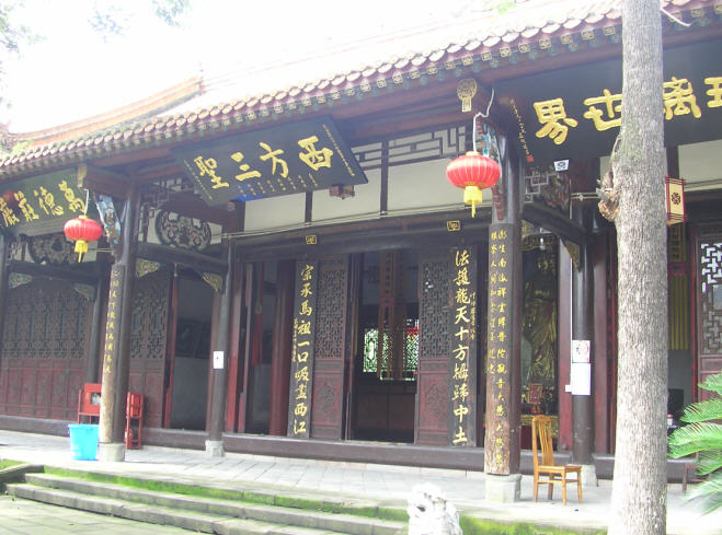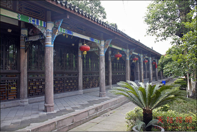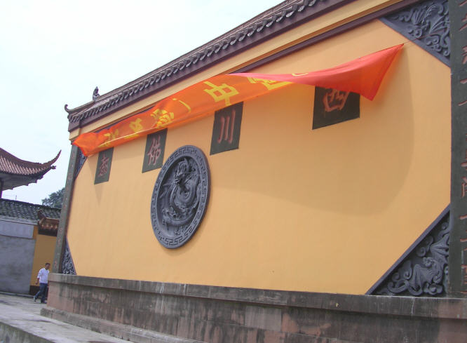 寺前照壁有“西川佛都”四个大字。寺门高大庄严,金壁辉煌。山门正悬“罗汉寺”三个金 光闪耀的大字为清康熙年前成都知府冀应熊所书。进山门为天王殿,然后是一青石镶成的广 场,弥勒佛(高五米,石雕)独坐中央。向前进是弥勒殿,旁有一联曰:“开口便笑,凡事付 之一笑;大肚能容,于人何所不容”。其两廊是五百罗汉殿,再前进是大佛殿。正中悬有“ 大雄宝殿”匾额,大佛释迦牟居两旁有阿难、迦叶侍立。再前为说法堂,后为藏经楼(寺内 藏经原1076部,鼎盛时达5048卷),两侧为东西方丈室。大雄宝殿左侧,有能容数百人参禅 打坐的禅堂和收留全国各地僧衣住宿的寮房;东方丈室下有库房和香积厨、斋所和客堂。全 寺佛殿为四幢,呈长方形结构,建筑整齐,所用材料全是木石结构;殿阁楼院,造型优美, 宏伟壮丽;门窗檐卷,以及柱、梁、枋、藻井,比彩绘精制成飞禽走兽、花卉鳞毛,栩栩如 生。整个庙宇的布局,系参考南充大林寺结构和规模,楼阁重叠,殿堂深邃,屋脊高耸,飞 檐凌空,更衬以参天古柏,高大竹树,显及十分雄伟庄严。