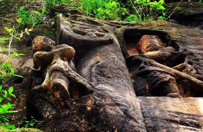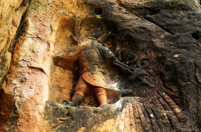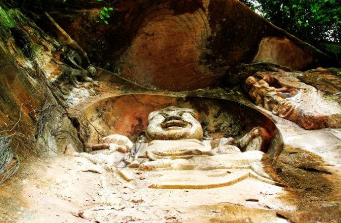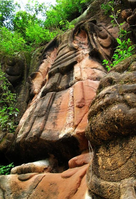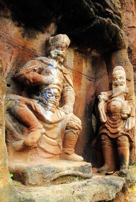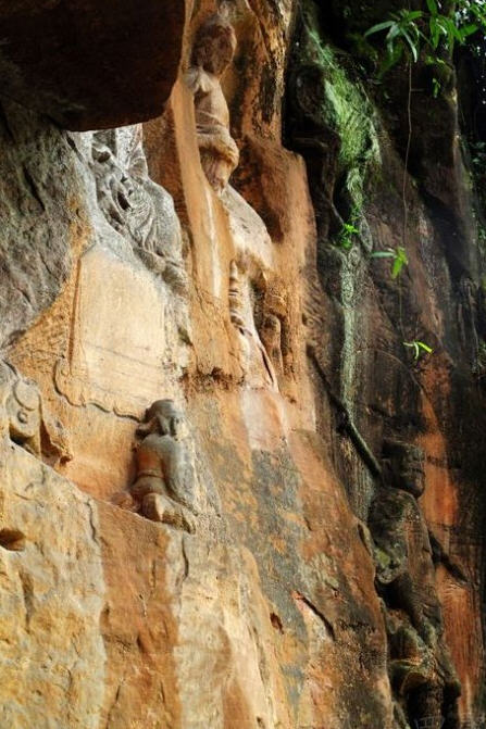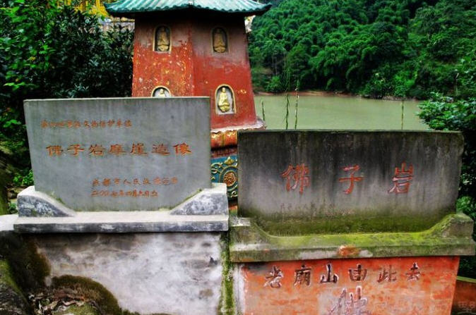佛子岩摩崖造像位于大邑县新场镇,为明代造像群。从现存造像的内容来看,是佛道两教共存的造像题材。由于山崖是红砂石质,造像风化严重。据当地人讲,这里原有灵官殿,离其不远就是川王宫,在这里开凿大量道教造像应该说是有信仰传统的。造像所在的山崖下临虎跳河,由于角度的关系,从山崖下的栈道无法看到佛子岩造像的全貌,只有乘船或到对面村庄才能看清。