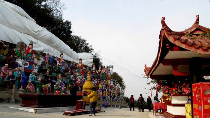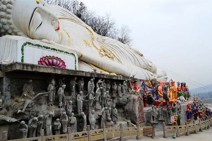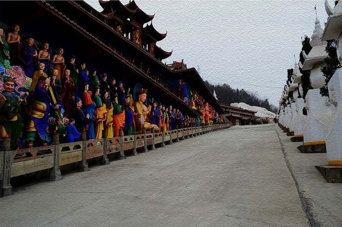 特别是流光溢彩的观音殿中,毗卢观音像极其庄严精美,慈祥中透露出自在,令人肃然起敬;大悲殿的四面千手观音菩萨像的眼神、手势各呈异彩,悲智的风范仪容惟妙惟肖,体现了佛菩萨造像“十全十美”的特色;仿清建筑大雄宝殿位于寺庙的中心,朱檐金瓦,雕梁画栋,庄重壮观,有《金刚经》碑碣三十二品立于大殿两侧,整体上给人以厚实丰赡的历史感;玉佛殿内的三尊缅玉佛像,由缅甸华侨捐赠,工艺精湛流畅,神态安详睿智;藏经楼大气典雅,藏经与讲堂禅堂合为一体,古色古香的建筑外观与现代科技的内部装修巧妙结合,室内各项设施设备达国家专业技术标准。圣水寺山门前,有宝成铁路、市区长虹大道直贯南北,车水马龙,人流如织,交通便捷。