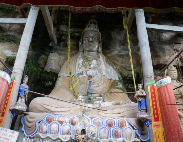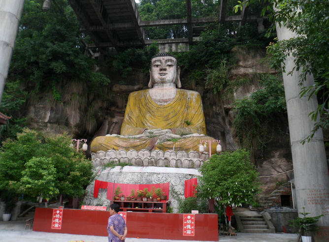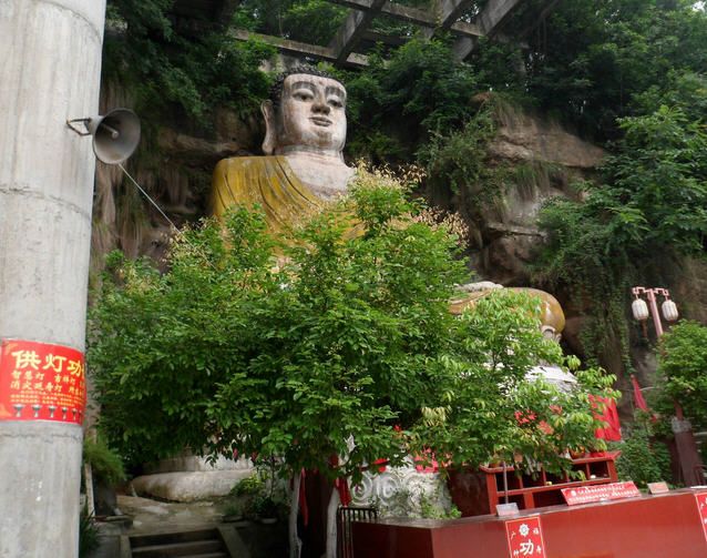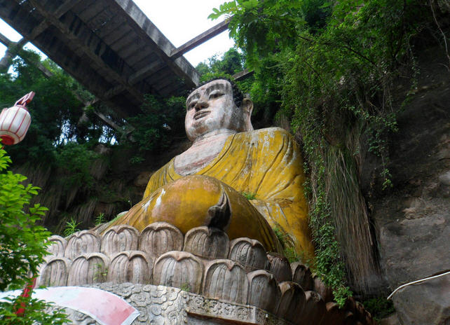 大佛造像凿建于元大德五年(1301年)坐东南朝西北,高8.3、肩宽3.8米,头饰螺髻,身着袈裟,善跏呋坐,成"说法像"。